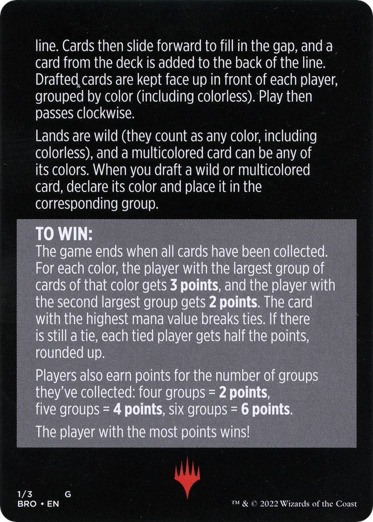 The game ends when all cards have been collected. For each color, the player with the largest group of cards of that color gets 3 points, and the player with the second largest group gets 2 points. The card with the highest mana value breaks ties. If there is still a tie, each tied player gets half the points, rounded up.
